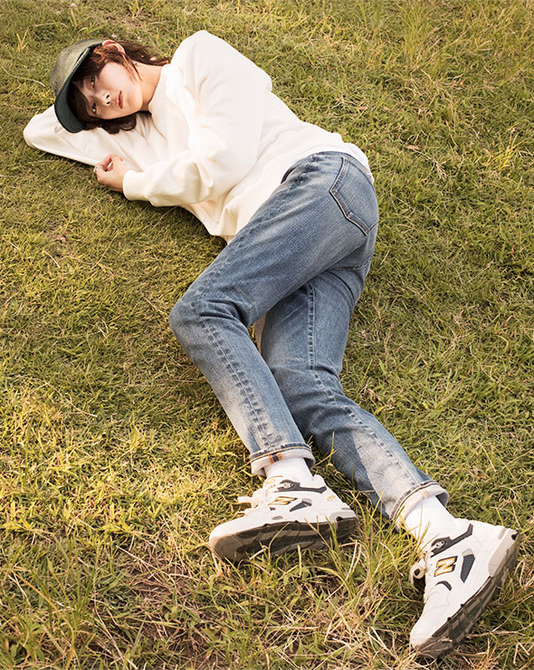90年代を彷彿とさせるシンプルかつ王道のストリートスタイル。軽くロールアップしたデニムとダッドスニーカーのゆるいバランスが絶妙。「普段からスエットにデニムといったシンプルな格好が多いですね。おじいさんがラフにデニムをはいている感じ(笑)。まさにあの抜け感が私の理想!」(リー・モモカ) デニム “アニバーサリー ハイライズ” [ 26403HR-akm] 1万9000円/レッドカード(ゲストリスト 03-6869-6670)、スエット 1万8000円/シーシーアールティー、キャップ 5000円/ローラス、リング 3万5000円、ピアス 1万2000円/共に ジャスティン デイビス(以上 ジャック・オブ・オール・トレーズ プレスルーム 03-3401-5001)、中に着たTシャツ 3800円/フルーツ オブ ザ ルーム(ダイヤモンドヘッド 058-388-8288)、シューズ 3万9000円/ニューバランス(ニューバランス ジャパンお客様相談室 0120-85-0997)、ソックス/スタイリスト私物