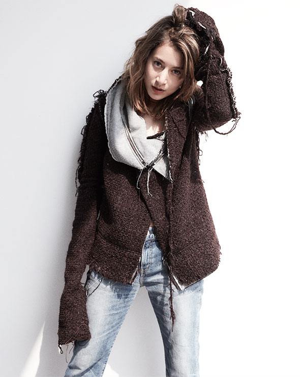 ありそうでなかった、程よい色落ち具合いの正統派デニムには、インパクトのあるツイードブルゾンでウィットを利かせて。「このテーパードデニムは、はき心地やシルエットがすごくナチュラル。私は気に入ったものを長く愛用するタイプなのですが、このデニムも次のお気に入りの1本に追加したい!」(マリエ) デニム “アニバーサリー テーパード” [71403T-kim] 1万9000円/レッドカード(ゲストリスト 03-6869-6670)、ブルゾン 15万円/パスカル マリエ デマレ(パスカル マリエ デマレ info@pascalmariedesmarais.com)、イヤーフープ 2万4000円/ジョージ ジェンセン(ジョージ ジェンセン ジャパン 0120-190-404) [TOP写真] ピアス 1万6700円、バングル 4万円/共にジョージ ジェンセン(ジョージ ジェンセン ジャパン 0120-190-404)