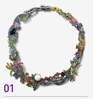 | カラフルな宝石をリズミカルにセッティングし、躍動感あふれるデザインに仕上げた“京ノ祭”ネックレス | 連なった輪にダイヤモンドの花をあしらった軽やかな印象の“花車”ブレスレット | |