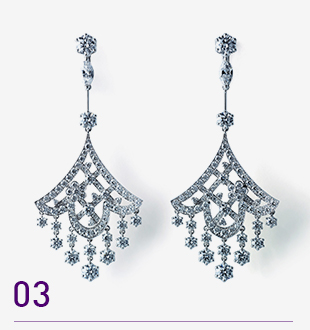 世界的人気モデルのミランダ・カーは、ボディーコンシャスなドレスに豪華に輝く“花雪”のイヤリングとリングをコーディネート。同コレクションは花のように華やかに開いた雪の結晶をモチーフとしたもの。ダイヤモンド一つ一つの大きさや配置や輝きに配慮し、立体的なデザインで仕上げている。