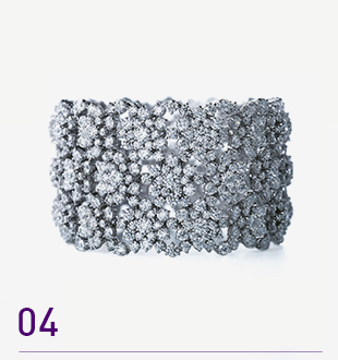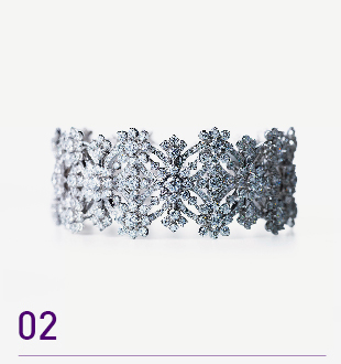 | 着ける人の体の動きに合わせて揺れ、煌きを放つ“梅宴”イヤリング | 緻密に施されたダイヤモンドが雪の結晶のように輝く“花雪”ブレスレット | |