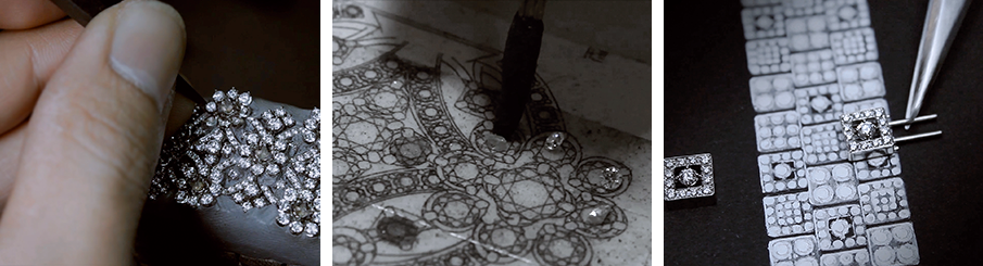 | 着ける人の体の動きに合わせて揺れ、煌きを放つ“梅宴”イヤリング | 緻密に施されたダイヤモンドが雪の結晶のように輝く“花雪”ブレスレット | |
