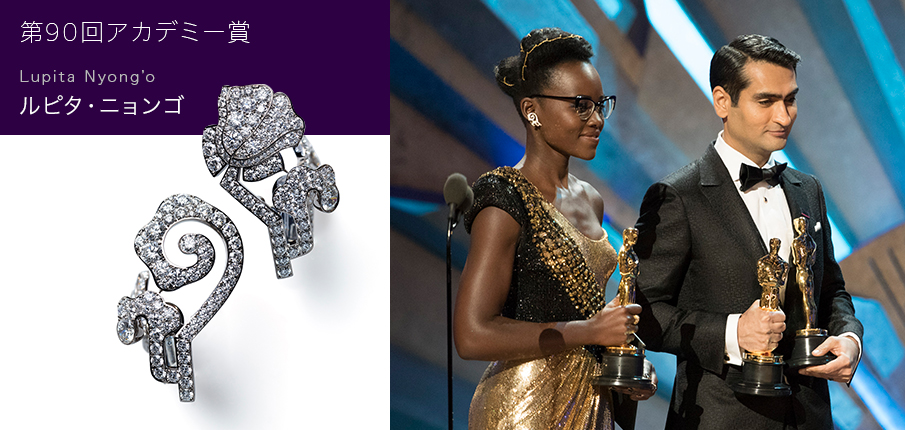 8世紀にエジプトから日本に伝わり、日本独自のモチーフとして発展した文様“唐花”。バックの留め具まで装飾された大胆なデザインのイヤリングが高く評価され、リングと共にオスカー女優のルピタ・ニョンゴが着用した。