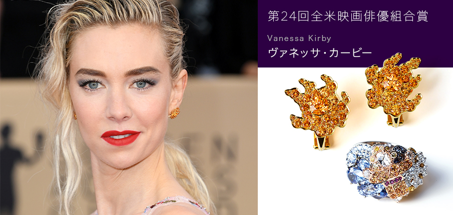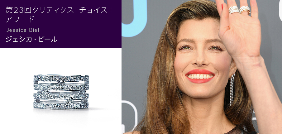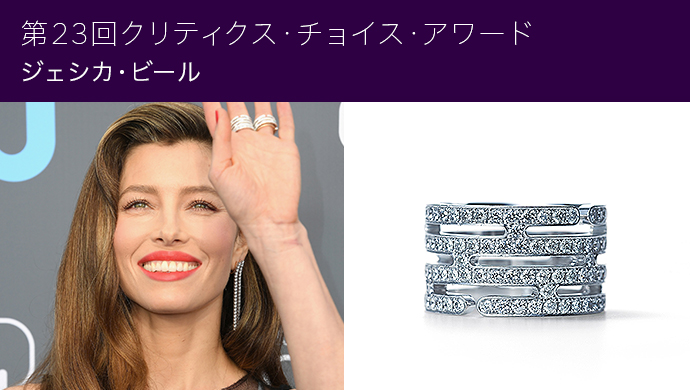 日本の絵画で時間や場所の移り変わりを表現する“かすみ”の文様をモチーフにしたコレクション。軽やかな空気感が漂うデザインが特徴だ。女優エリザベス・チェンバースは、しなやかに揺れるイヤリングをチョイス。歌手ジャスティン・ティンバーレイクのパートナーで女優のジェシカ・ビールは“八重霞”のリングを複数着用して登場した。