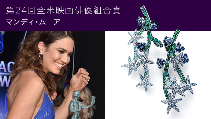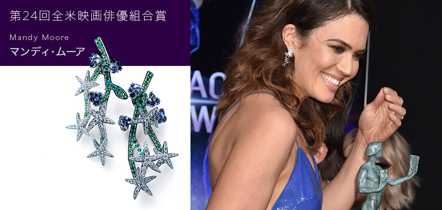 女優、歌手として人気の高いマンディ・ムーアが着用したのは、野に咲く草花を生けた“花籠”がモチーフのイヤリング。グリーンのグラデーションの茎が立体的に交差し、ホワイトとブルーの花が方々に咲く有機的なデザインだ。