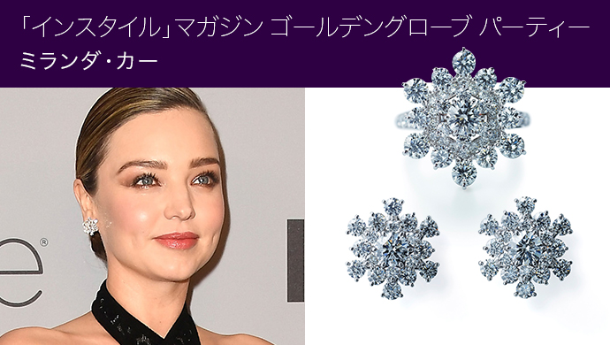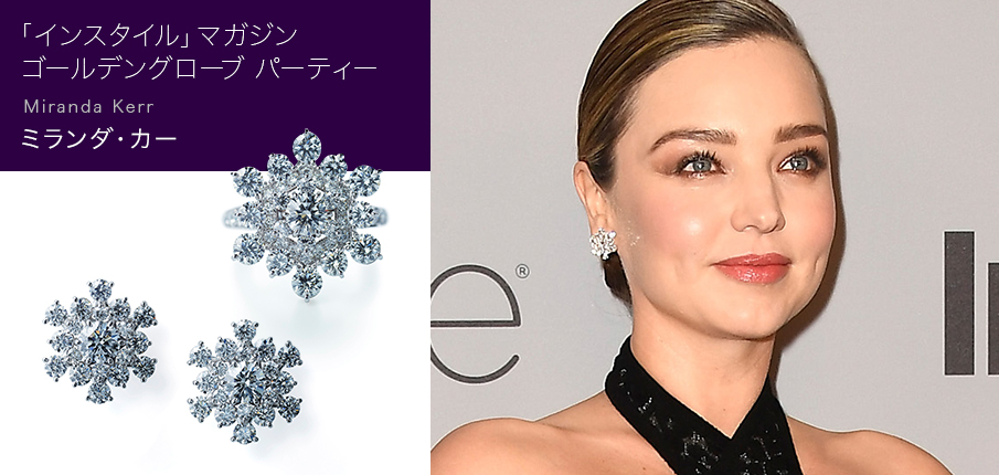 世界的人気モデルのミランダ・カーは、ボディーコンシャスなドレスに豪華に輝く“花雪”のイヤリングとリングをコーディネート。同コレクションは花のように華やかに開いた雪の結晶をモチーフとしたもの。ダイヤモンド一つ一つの大きさや配置や輝きに配慮し、立体的なデザインで仕上げている。