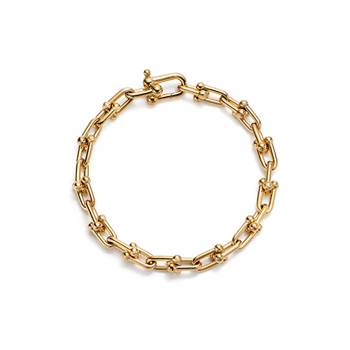 “ティファニー ハードウェア ミディアム リンク ブレスレット”[18KYG] 39万円 リング(右手薬指)“ティファニー ハードウェア ボール リング”[18KYG] 11万2000円、ブレスレット(左手)共に“ティファニー T スクエア ブレスレット”[ブラックコーティング ステンレススチール] 各15万9000円