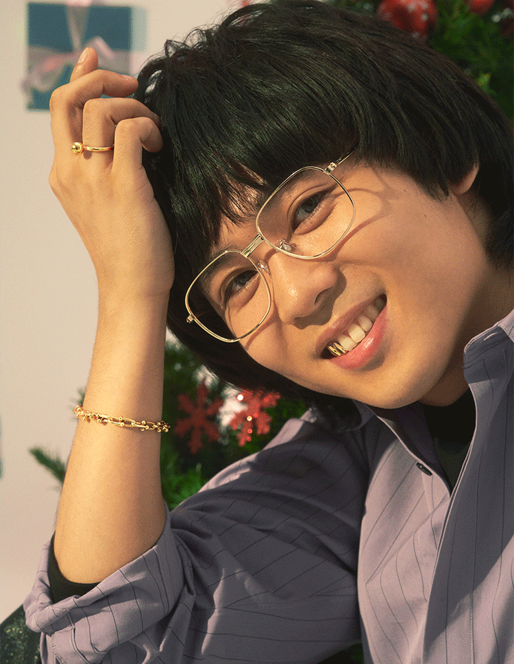 無邪気なスマイルと時折見せるヤンチャな視線は、ひとつの枠にとらわれない自由な表現力がリンクしているかのよう。