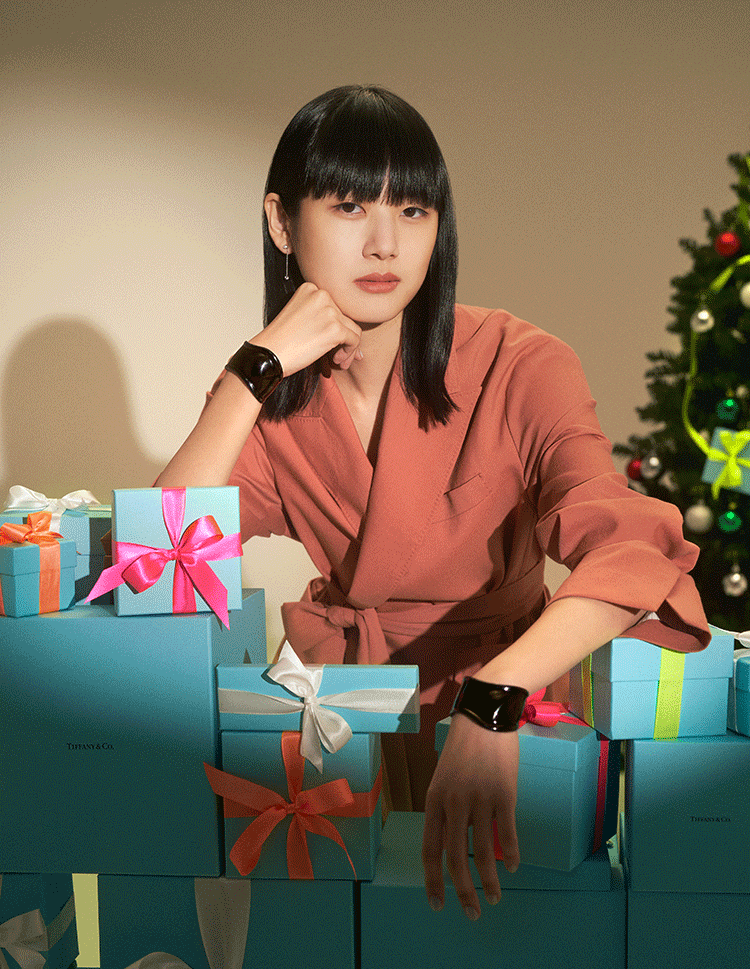 手首を優雅に包み込むアシンメトリーなフォームが魅力の“ボーン カフ”。コッパーにブラック カーボン フィニッシュをあしらった凜とした佇まいは、女性の強さを表わしているかのよう。「日本人モデルが海外で活躍し続けるためには、常にソリッドであることが求めらます。なのでジュエリーも、フェミニンというよりはどちらかと言うとエッジの利いたデザインを好むようになりました。『ティファニー』の“ボーン カフ”はシルバーが定番だけれど、私はあえてブラックをチョイス。シックなスタイルにワンポイントとして取り入れたいですね」。