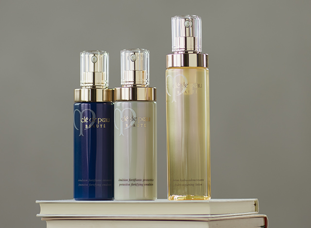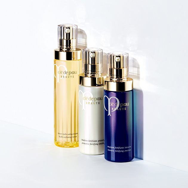 みずみずしく肌表面に明るさをもたらす化粧水と、一日中輝きを守り抜く日中用乳液、紫外線や乾燥によるダメージをケアする夜用乳液。毎朝晩のスキンケアで、使うたびに高揚する触れ心地と内から輝く肌を実現。