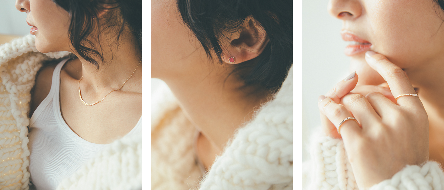 ネックレス[18KYG×DIA]12万円、ピアス[10KYG×RUBY]2万8000円、(左手人差し指)リング[18KYG×DIA]4万2000円、(左手小指)リング[10KYG×DIA]2万9000円