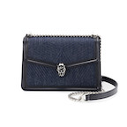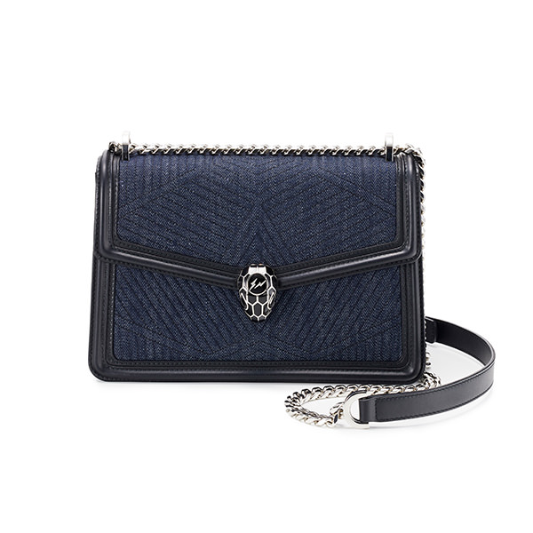 センシュアルなオールブラックの装いがトレンドにカムバック。主役となるのは、軽やかなデニム地を用いた“セルペンティ”だ。こちらもスネークヘッドにサンダーボルトが施され、無骨なシルバーチェーンとパワフルに絡み合う。伝統と最新のクリエイティビティが凝縮された最新バッグに加え、ピンクのシェリーでアクセントを添える。「シンプルなワントーンコーデに重厚感のあるバッグを合わせるのが今の気分。卓越した職人の技によって作られているからこそ、一生モノとして大事にしたいですね」。