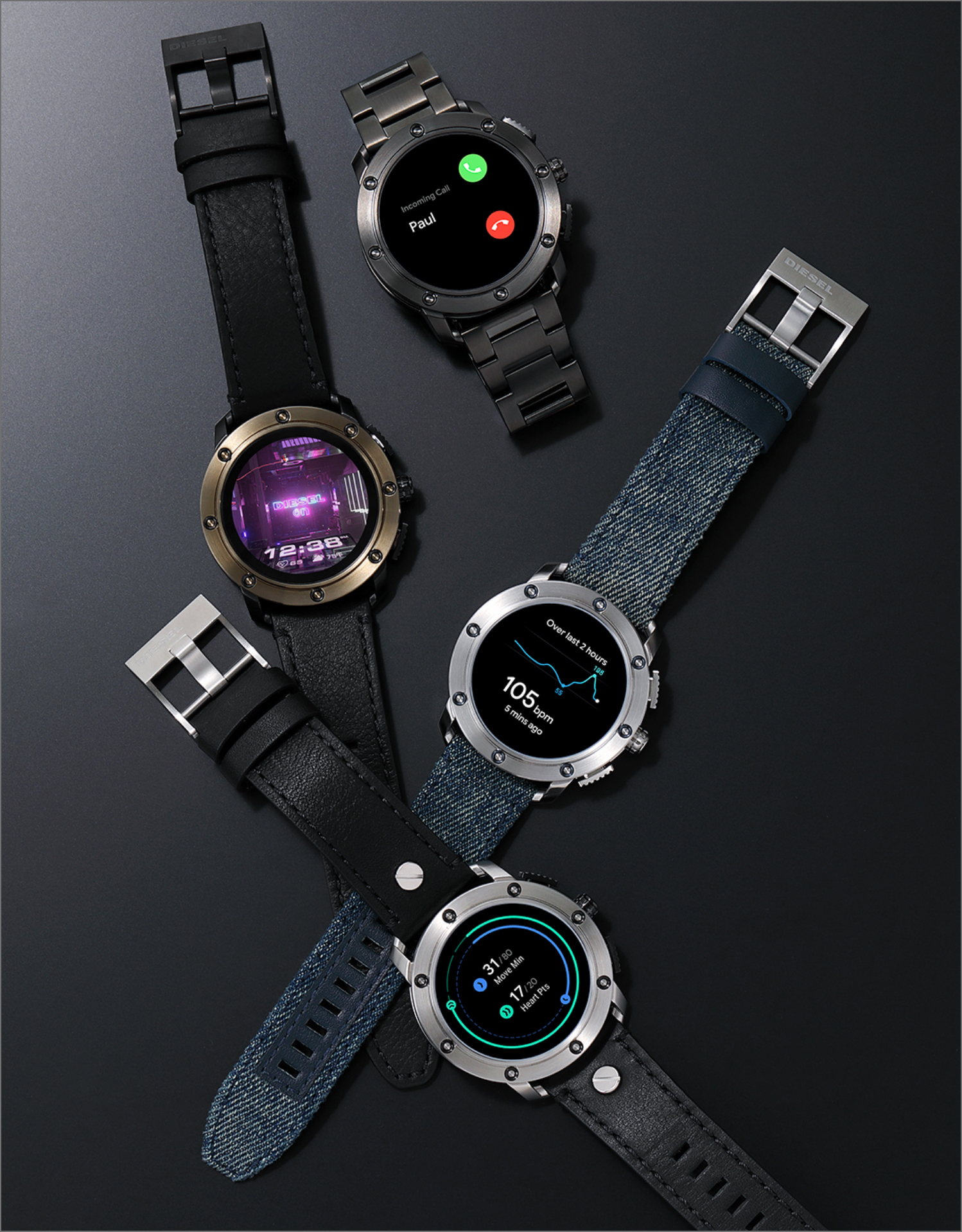 Wear OS by Googleを搭載し、スマートフォン(iOSとAndroidの両方)とBluetooth接続で連動。これにより電話やLINE、SNSなどさまざまなアラートをバイブと光で通知する。また「ディーゼル」らしいウイットに富んだメッセージを表示するマイクロアプリ「T-ON-I(トニ)」も興味深い。また新搭載のスピーカー機能では音楽を聴くだけではなく、ウオッチ上でスマホの着信を受けて応答したり、Google翻訳による言葉を音声として聴くことも可能(一部機能は現在Androidユーザーのみへの提供)。天候情報の表示や万歩計など定番機能も完備。最新技術により、これまで以上のカスタマイズ性と革新的なパフォーマンスを実現した。各5万1000円。