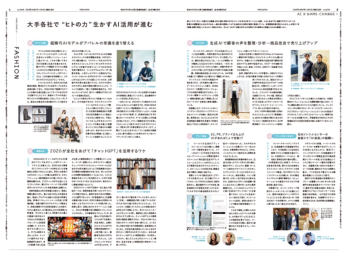 特集前半では、ファッション編としてODMの進化版VDM(ビジュアル・デザイン・マニュファクチュアリング)を掲げるレオンインターナショナルと「リエンダ(RIENDA)」のAIモデル導入や「ファッション業界最強のAIの遣い手」であるZOZOの「チャットGPT」の社内活用などを取り上げています。